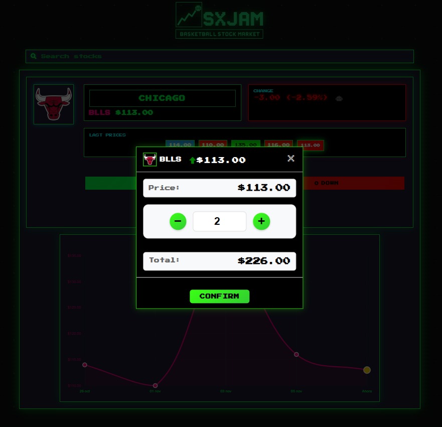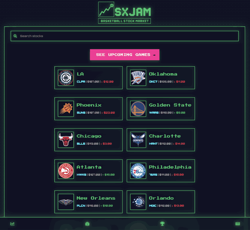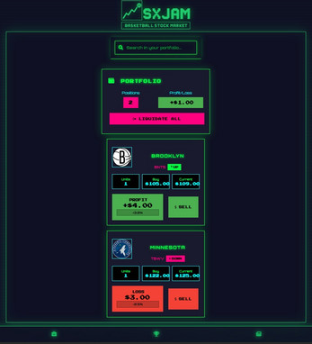 SXJAM is the ultimate fantasy trading game. Trade basketball teams like stocks. Every real NBA game changes prices! Trading on teams you trust to predict whether their score will go up or down compared to the previous match. Compete with friends in private leagues or challenge the world in global rankings!